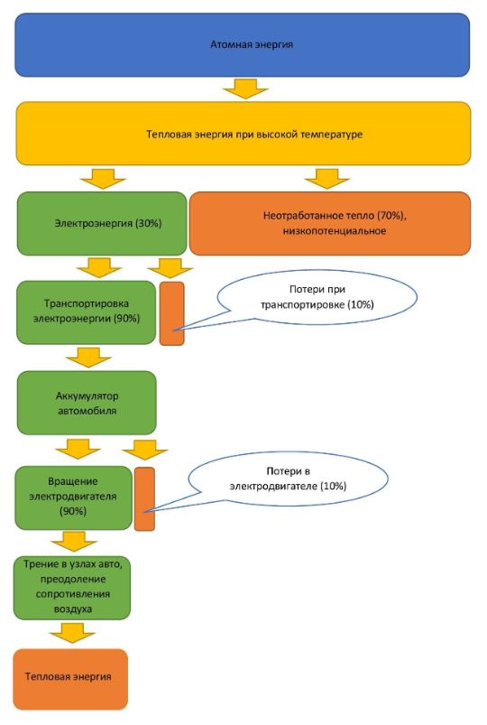 В итоге мы получили 30 единиц электроэнергии – «экологически чистый продукт», - скажете вы. Но это не так. Далее электроэнергия в процессе транспортировки по проводам от электростанции до потребителя частично теряется на омическое сопротивление проводов, что также приводит к их нагреву. При заряде и разряде аккумуляторов часть электроэнергии также превратится в них в тепло. Допустим, что из розетки в аккумулятор нашего электромобиля попало 25% от изначального количества энергии, извлеченной из атома, а 75% ушло в тепло. Мы сели в наш автомобиль и поехали, и электроэнергия из аккумуляторов превращается в энергию вращения электродвигателя, КПД которого, скажем 90%. Остальные 10% вновь превратятся в тепло непосредственно в электродвигателе. Энергия вращения электродвигателя в дальнейшем израсходуется на преодоление трения в механизмах автомобиля, трения колес об асфальт и преодоление сопротивления воздуха. В ходе всех этих действий мы вновь получим тепло. В итоге, все 100% изначальной энергии, полученной от распада атома, в ходе различных преобразований превратятся в тепловую энергию! И это неизбежно приведет к нагреву планеты.
